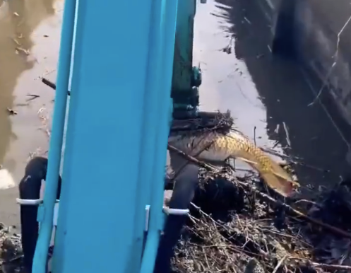 男子开挖机清理河道,结果夹上来一条大鱼,男子:今晚可以加餐了。...